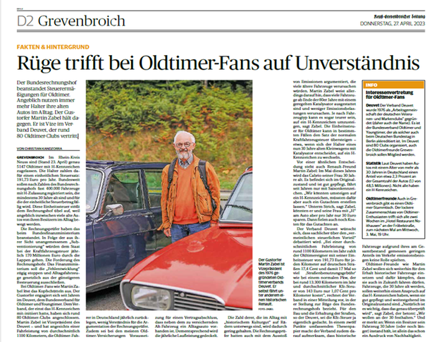 Der DEUVET steht seit Jahrzehnten für den Erhalt historischer Fahrzeuge und vertritt als Bundesverband die Interessen von Oldtimer- und Youngtimer-Besitzerinnen und -Besitzern in Politik, Gesellschaft und Medien. In unserem Pressespiegel finden Sie ausgewählte Medienberichte, Interviews sowie Stellungnahmen des Verbandes zu aktuellen Themen rund um historische Mobilität, Gesetzgebung, Kulturwert und technische Rahmenbedingungen.